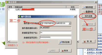4、点击需要修改的账套,点击旁边的修改连接,然后在弹出来的服务器信息上把红圈圈出的地方修改成服务器IP地址,然后点测试连接,测试连接通过后就能打开了