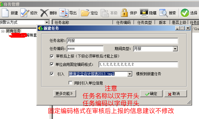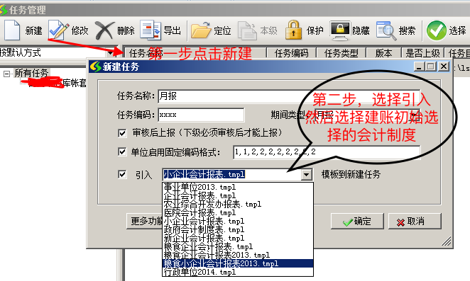 这里要特别注意任务名称必须以汉字开头,任务编码必须以字母开头,期间类型选择月报,审核后上报与单位启用固定编码格式这两项建议默认不要修改。勾选“引入”前方框,并点击后面下拉按钮选择需要引入的报表模板(注意报表模板一定要选择与当前登录账套的会计制度一致,提示:可通过打开财务软件左上角【开始】按钮——选择【账套选项】可查看当前账套所使用的行业会计制度)