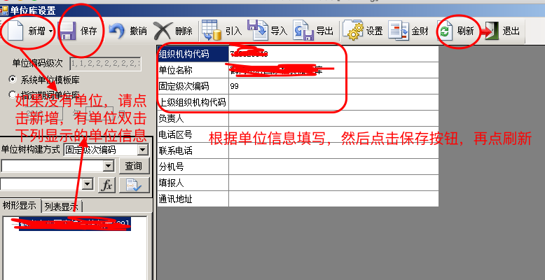 特别注意:在单位信息维护右边表格中前3项必须录入,组织机构代码输入单位9位组织机构代码(即18位税号的第9--17位,不是最后9位!),单位名称如实输入,固定级次编码输入99[,其余项目可以不用输入。信息输入完毕后,点击工具栏【保存】和【刷新】