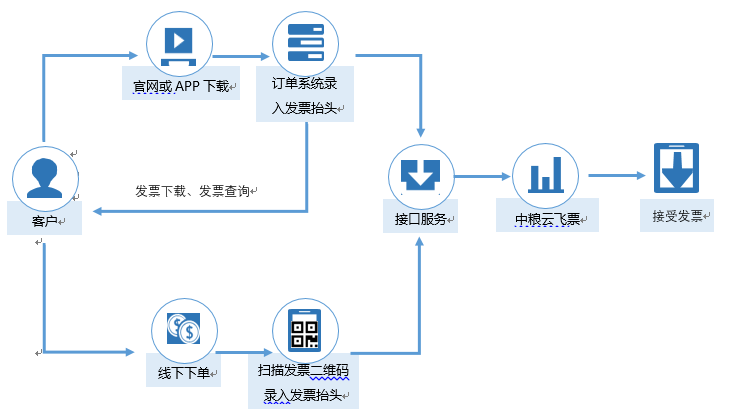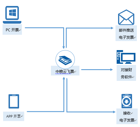 企业通过中粮云飞票服务平台PC端或手机APP开具电子发票,无需用户进行技术对接和软件开发工作,即插即用。