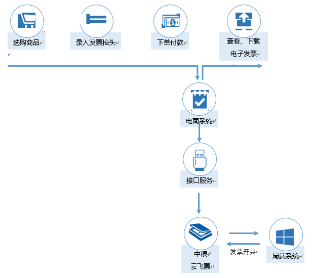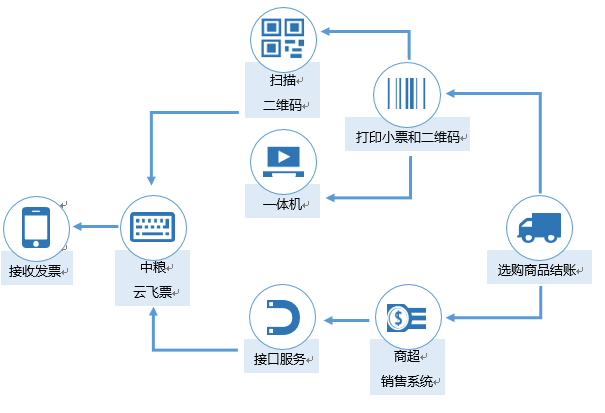  商超销售系统对接中粮云飞票服务平台,根据交易信息直接生成电子发票推送给消费者。