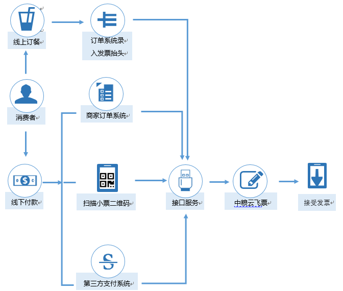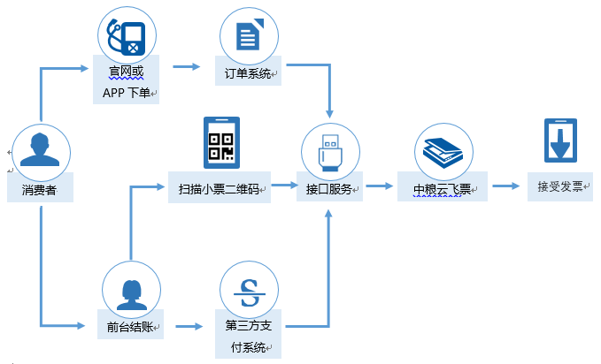  消费后商家打印开票二维码,消费者扫码进行开票,通过短信、邮箱等接收发票;